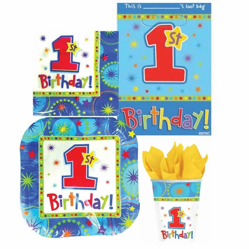 Themed to suit a one year old boy’s birthday, this pack has everything you need to serve food and send each child home with a lolly bag!