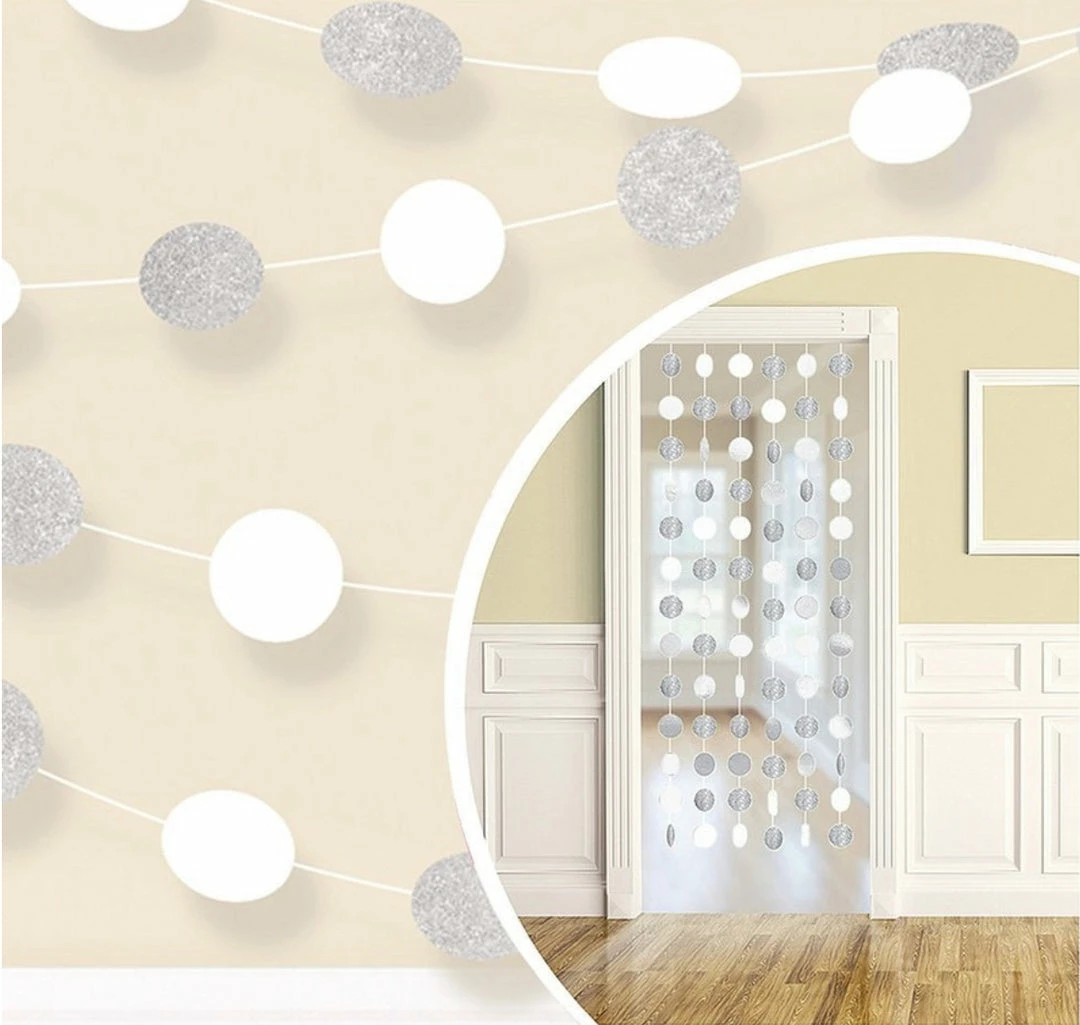Add some glitz and glam to your decor with Glitter Silver Polka Dot String Decorations. These whits polka dot decorations feature round, double-sided white cutouts strung along an invisible plastic string. Half of the polka dots are metallic white and the other half are covered in silver glitter. At 7ft long, these white string decorations can be hung vertically in an entryway or doorway or draped horizontally across mantels and walls!
