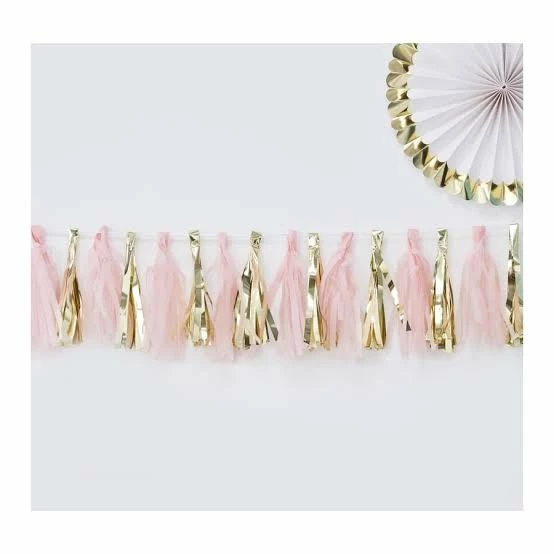 Decorate your space with this Ginger Ray Tassel Gardland in pink and gold. The gold foil tassels shine brightly around the room, offset by the baby pink tassels. Hang this gardland on walls and doorways or use it as a photo booth background for your baby shower, birthday, or any pink-themed party.