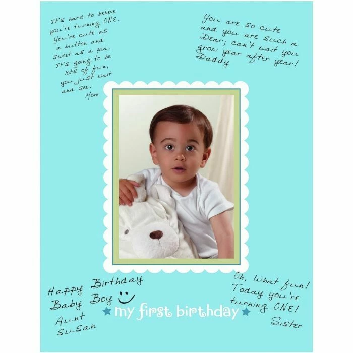 Create a special keepsake with our beautiful Boys 1st Birthday autograph matte., Item is made from cardboard and measures 27.9cm x 35.5cm.