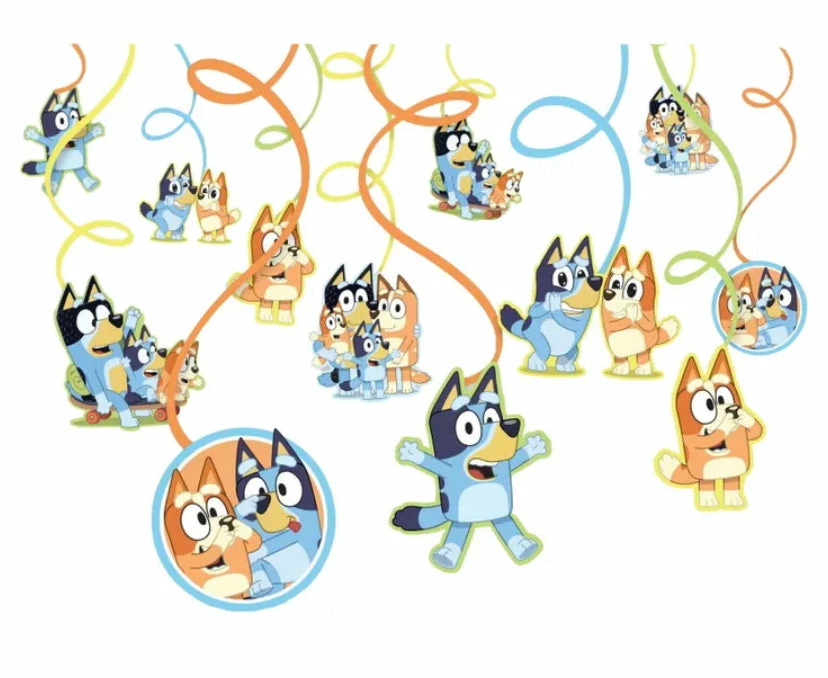 12 paper swirls with 10 – 15cm in diameter Bluey themed characters attached.