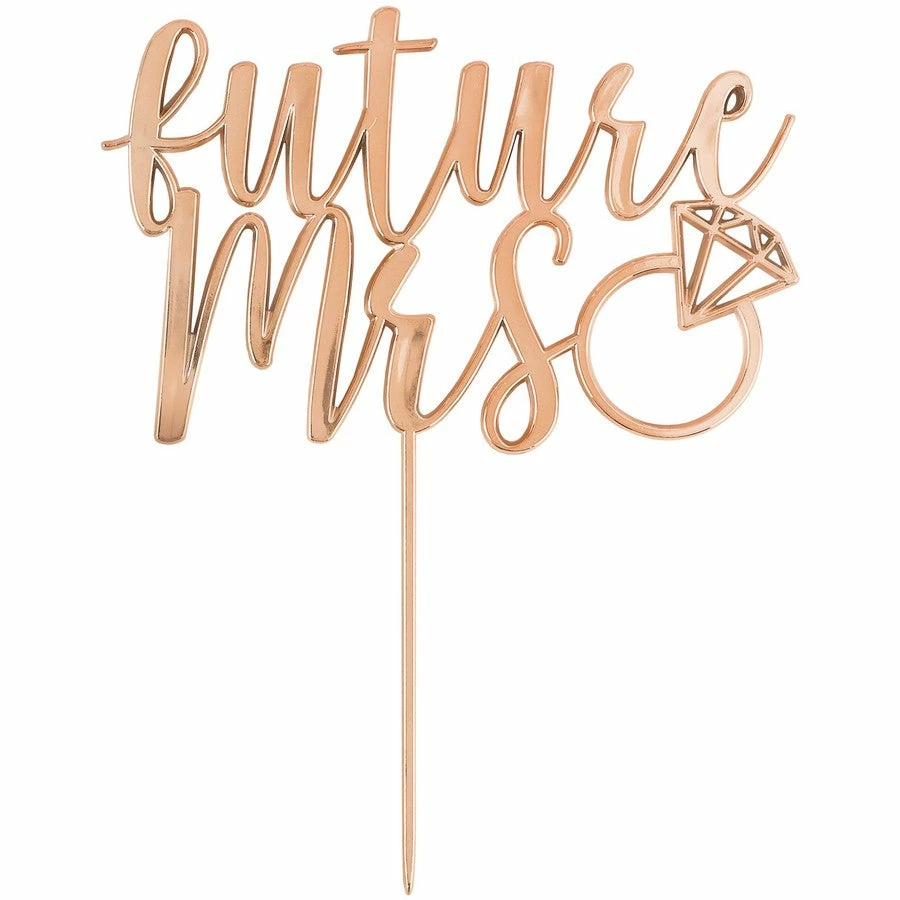 Top the bride-to-be’s cake with the Rose Gold Future Mrs. Cake Topper! This rose gold cake topper decoration features the headline “Future Mrs” in script letters with a diamond ring on an attached stick. Place on the top tier of a bridal cake or dessert as a fun way to celebrate the future bride. Use the Rose Gold Future Mrs. Cake Topper at bachelorette parties or bridal showers.