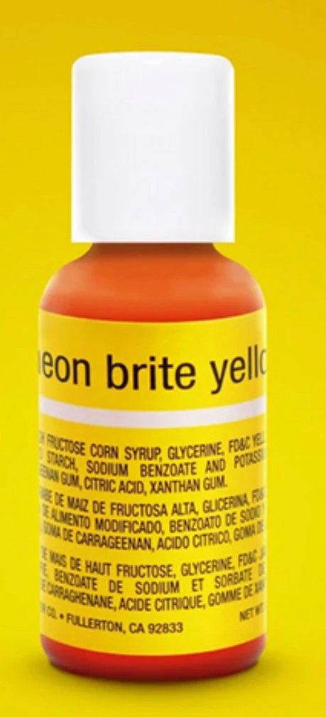 This Chefmaster Liqua-Gel Neon Brite Yellow is a highly concentrated, vibrant food colouring that mix easily and provide consistent tones without altering the texturing of your product. Colours are intense, bright and vivid. Easy to mix and disperse instantly. Gels come in 0.7oz (20ml) squeeze bottle with twist-top lids, so you can add drops for easy-to-repeat colors every time. Use in whipped icing, buttercream, fondant, cookies, and more.
