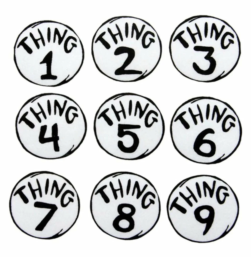 Inspired by the patches the mischievous twins Thing 1 and Thing 2 have in the Dr Seuss book The Cat in the Hat. These Dr Seuss Thing 1 to 9 9 Piece Patch Set will really help you look the part as one of the Things or even a great gift for anyone one who’s a fan of the books. Printed in the black on white patches with an iron back for easy sticking using an iron. Great for a group costume.