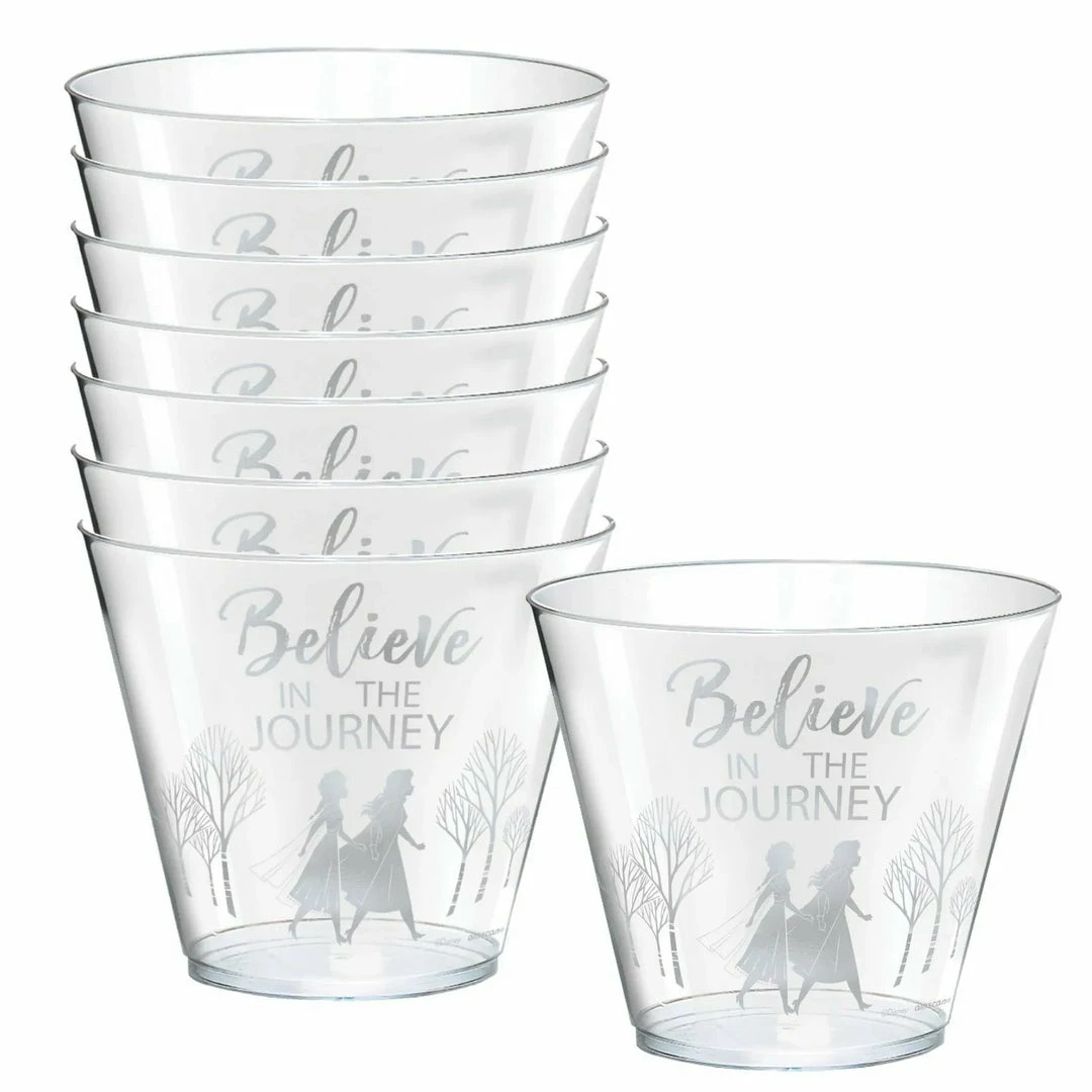 These beautiful clear plastic cups feature silhouettes of Anna and Elsa walking through a forest with the wording “Believe In The Journey.” A stunning alternative to paper cups, your guests can wash and keep them after the party!