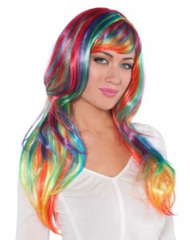 Make a bold statement with this long wavy rainbow wig. Dress up as an edgy pixie, a My Little Pony fan, a unicorn, or wear it to your local Pride Parade!