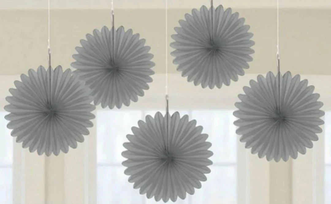 Leave an Impression our Silver Mini Paper Fan decorations to create a dazzling display for any party or event. Each pack includes 5 Mini Fans measuring 6in wide and includes string for hanging and are simple to assemble. Arrange fans of a single colour or mix and match from our available range with the options of light and dark shades.