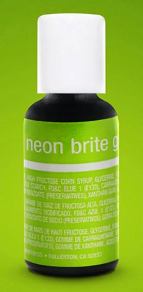 This Chefmaster Liqua-Gel Neon Brite Green is a highly concentrated, vibrant food colouring that mix easily and provide consistent tones without altering the texturing of your product. Colours are intense, bright and vivid. Easy to mix and disperse instantly. Gels come in 0.7oz (20ml) squeeze bottle with twist-top lids, so you can add drops for easy-to-repeat colors every time. Use in whipped icing, buttercream, fondant, cookies, and more.