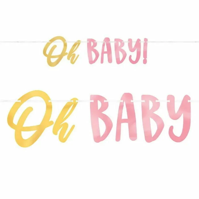 Banner is made of cardboard, printed on one side only and has the wording Oh Baby in gold and pink writing.