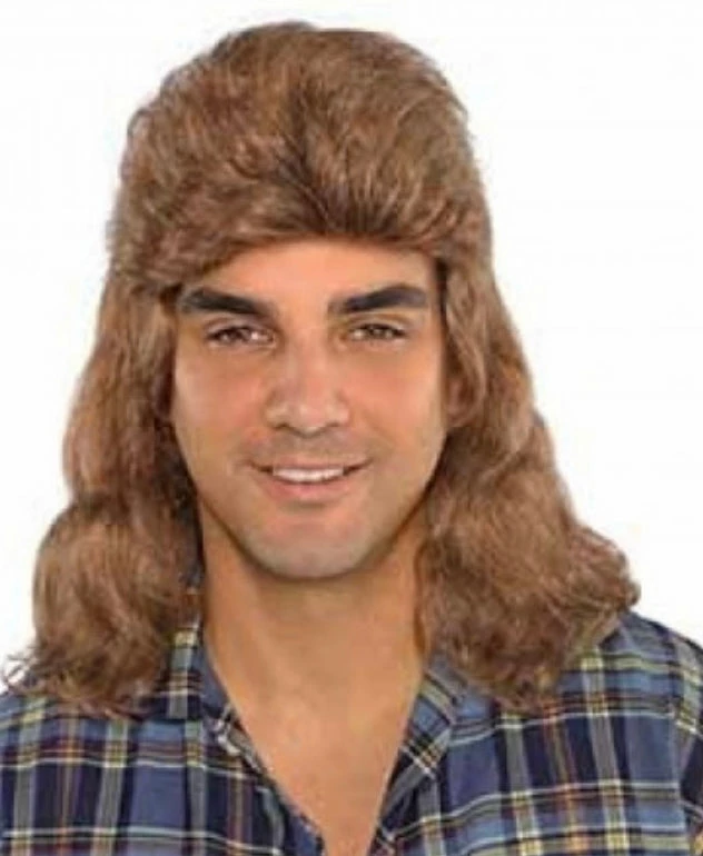 Wig Mullet Head – Fits Adults. Do Not Use styling tools with heating elements, this will damage synthetic fibre. Cool styling tools, plastic curlers and hairspray recommended. Intended for Adult novelty use only.